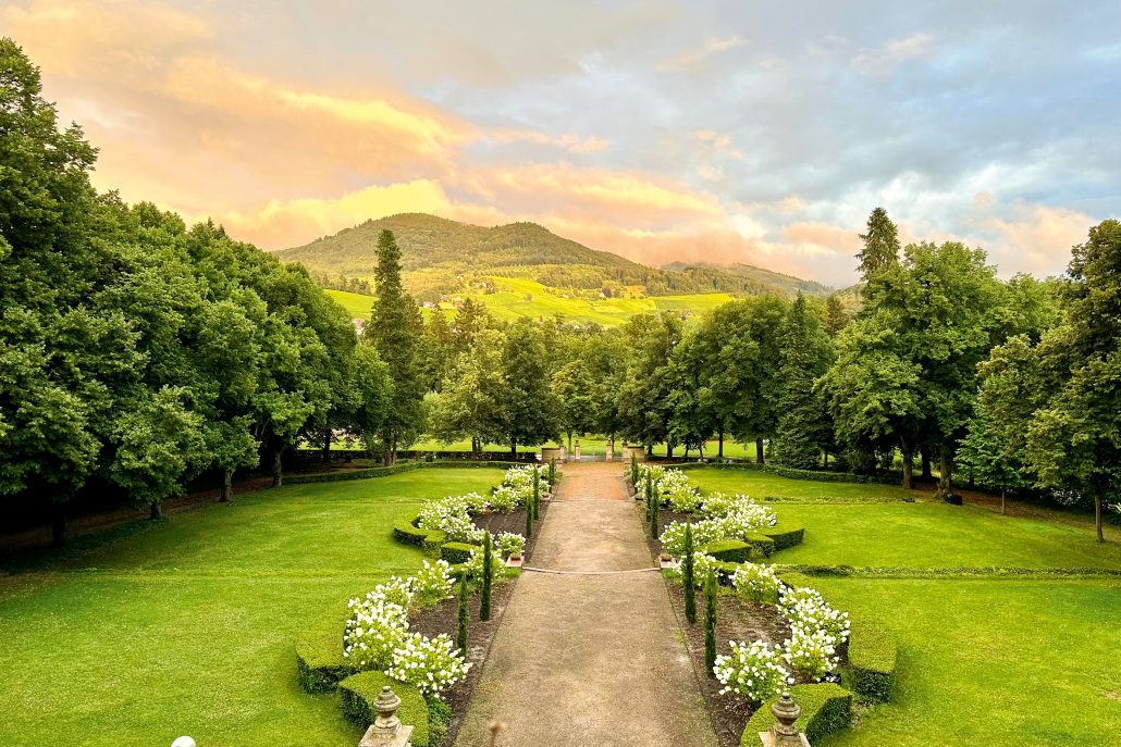 Allein die Auffahrt zum Palais lässt die Erwartung auf ein Höchstniveau wachsen. Eingebettet in eine traumhafte Parklandschaft mit weitläufigen Gärten, bunten Beeten mit Blumen und Gemüse, ist es umgeben von unzähligen Kirschbäumen und Weinbergen.