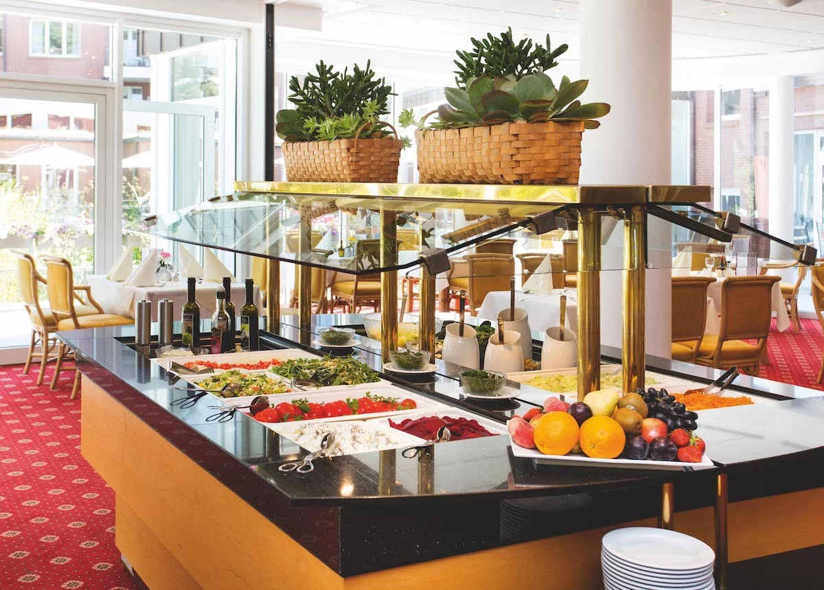 Viele Vorzüge des Hauses erschließen sich schon nach den ersten Metern: der Wintergarten und danach die Oase des Innengartens mit einer großen Linde und einer alten Eiche, links von der Halle das Café und das Restaurant, rechts die Bar, unter allem der rote Teppichboden – das alles zeigt Entgegenkommen und Wärme…